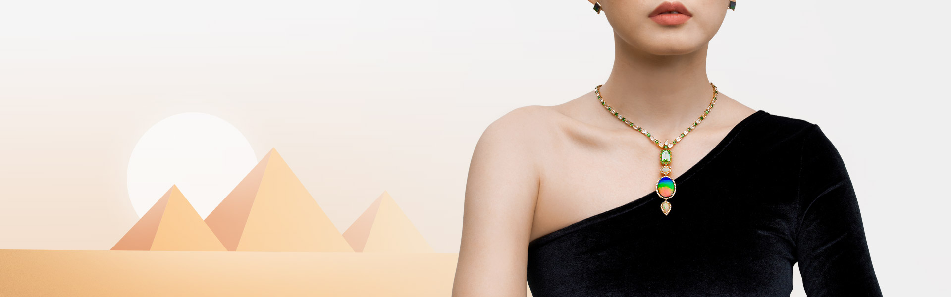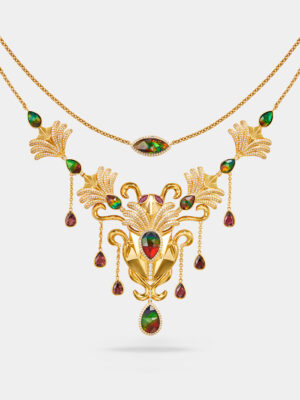 Introducing the Yillina Collection, where the majestic scarab beetle is transformed into breathtaking jewellery. It features intricate wing designs, evoking the scarab’s powerful flight. Dazzling gemstones dangle gracefully, capturing the essence of eternal renewal. But the true heart of Yillina lies in ammolite. Its mesmerizing iridescence, ever-shifting and alive, embodies the transformative power of the scarab as it pushes forth into a new dawn.