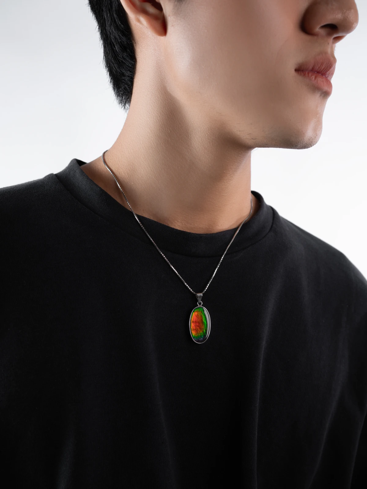 Encased in an elegant oval frame, the natural freeform Ammolite reveals a kaleidoscope of colours. Each piece is unique, embodying rarity and elegance.
