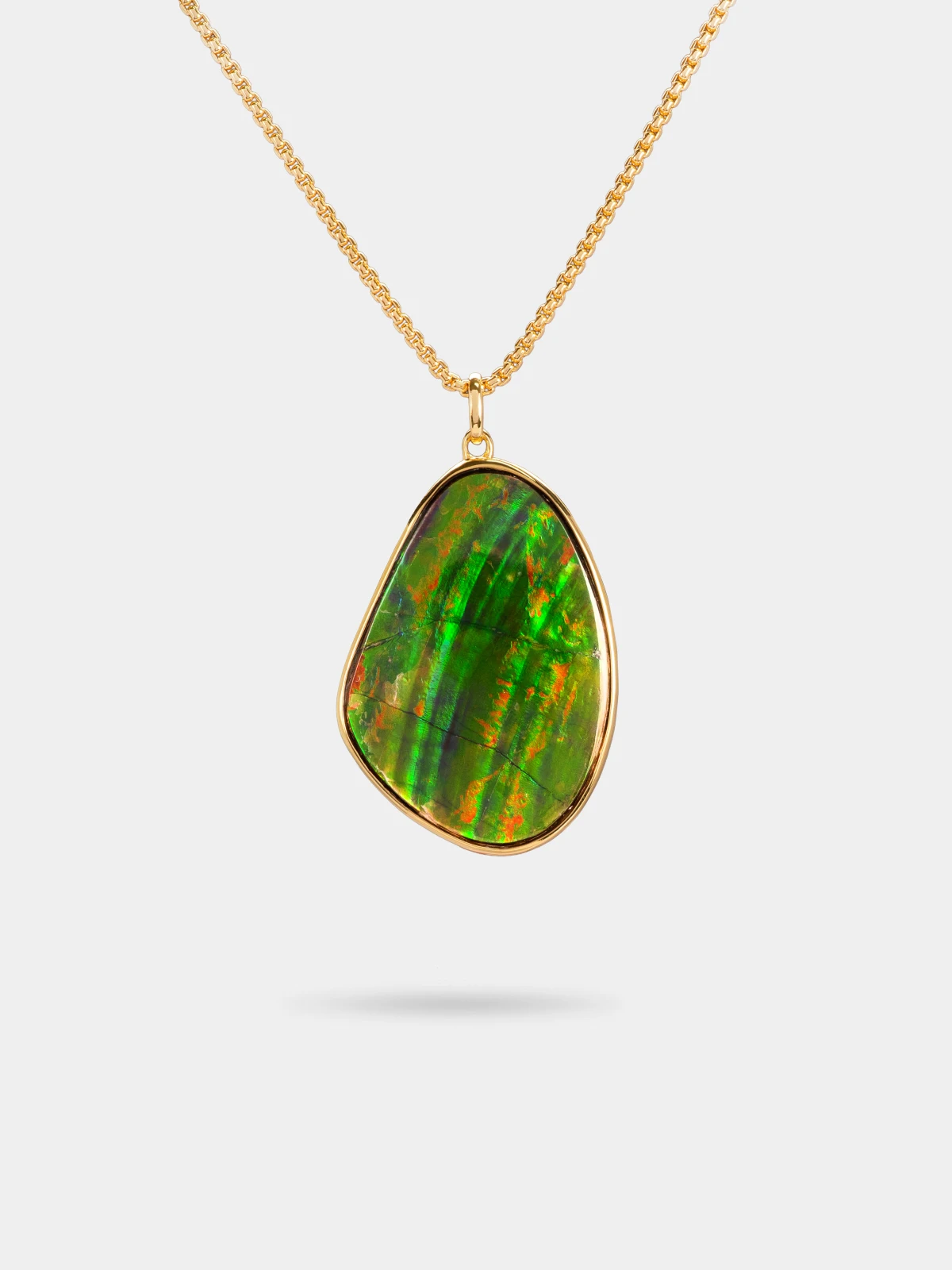 A freeform Ammolite is framed in polished gold, allowing its natural curves to define the pendant’s shape. The design captures effortless elegance through simplicity and flow.