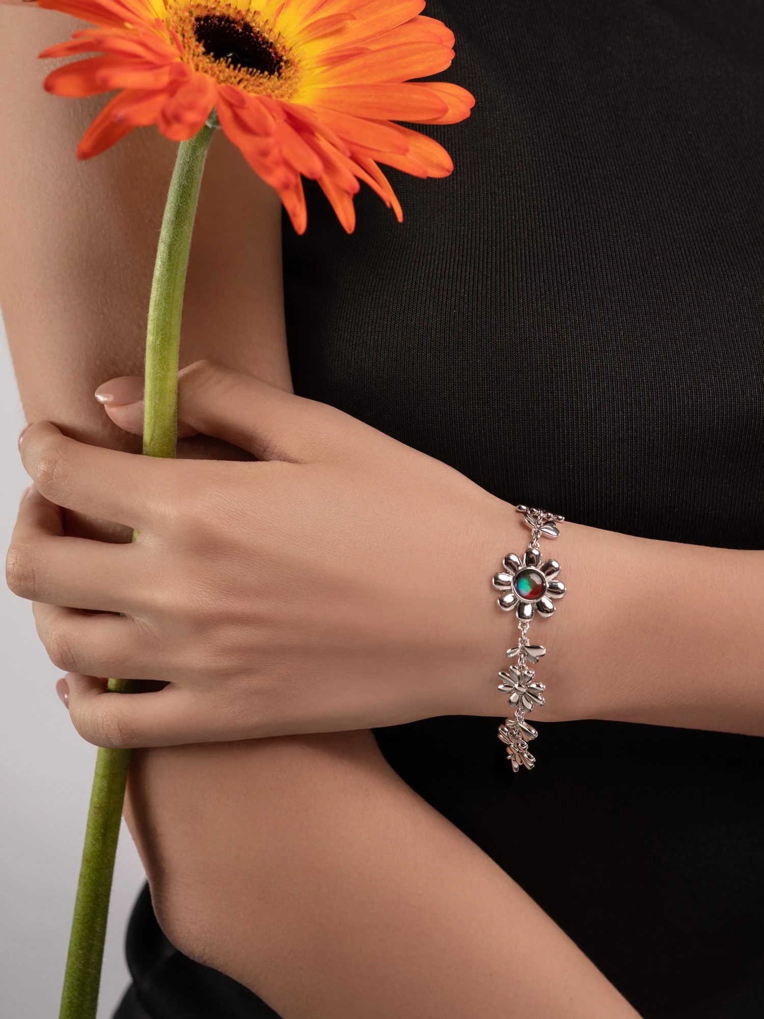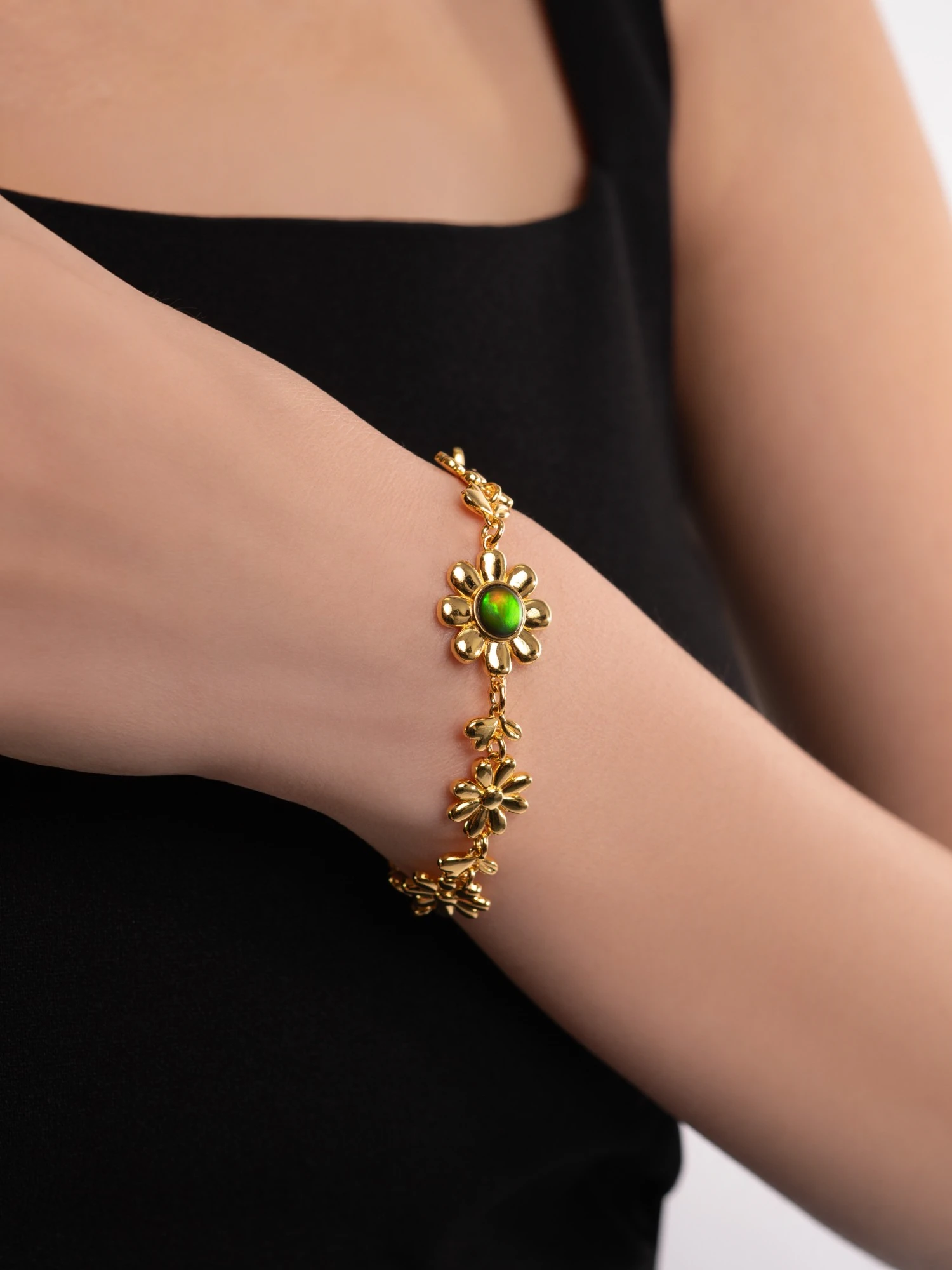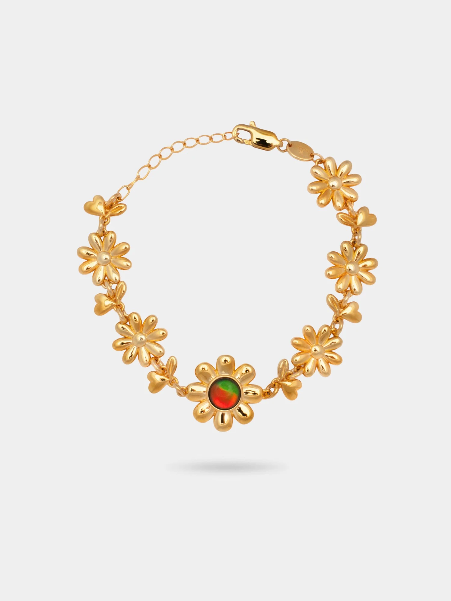 A bright ammolite cabochon lights up a daisy at the center, with polished daisies and tiny hearts circling the wrist. Sweet, luminous, easy to love.