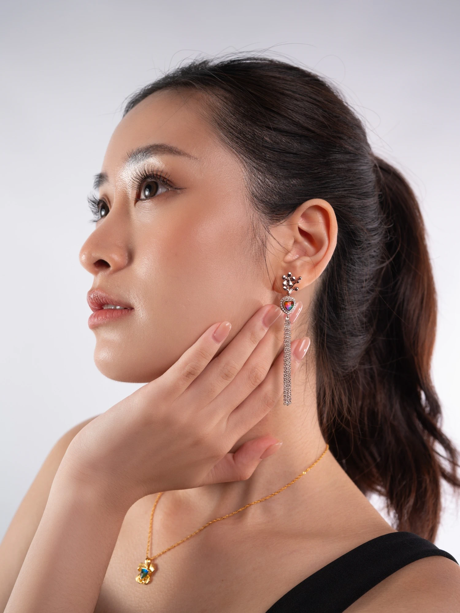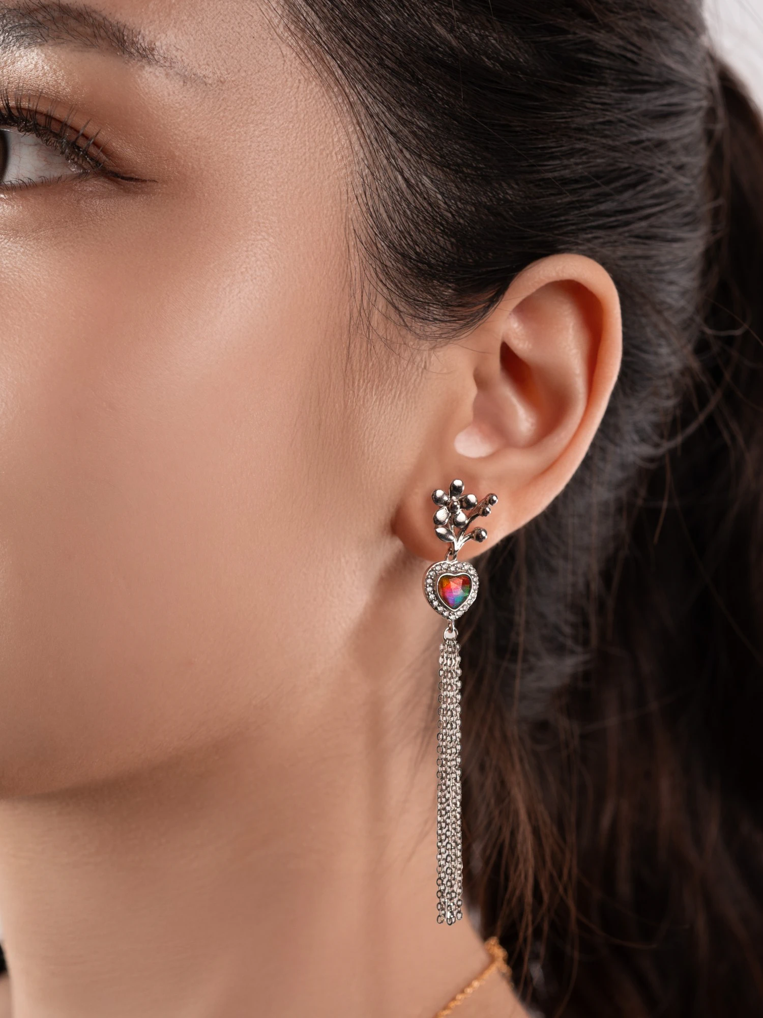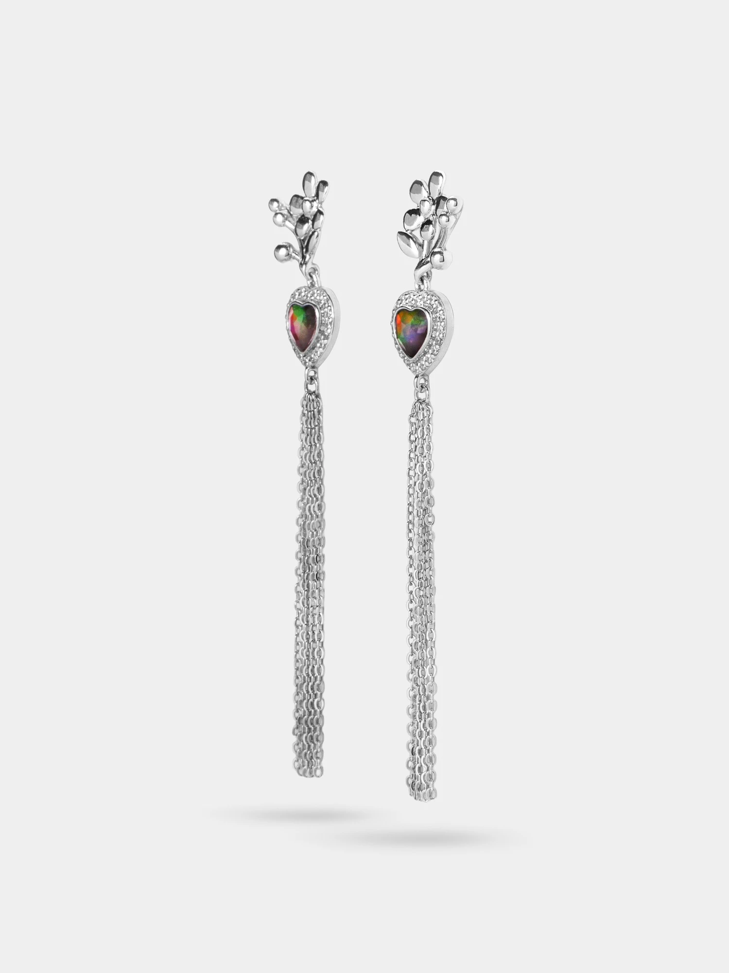 An ammolite heart ringed in pavé cubic zirconia and fluid chain tassels that catch every glint.