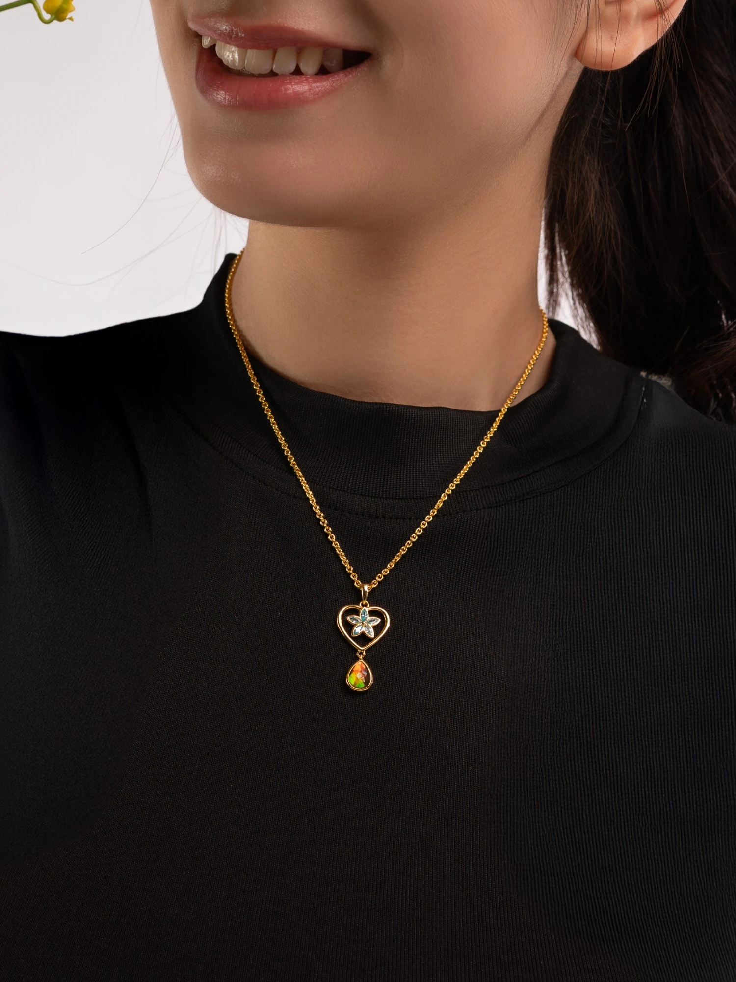 Inspired by garden mornings, a petite blue blossom opens inside a golden heart while a pear of ammolite catches the sun below—colour that moves with you.
