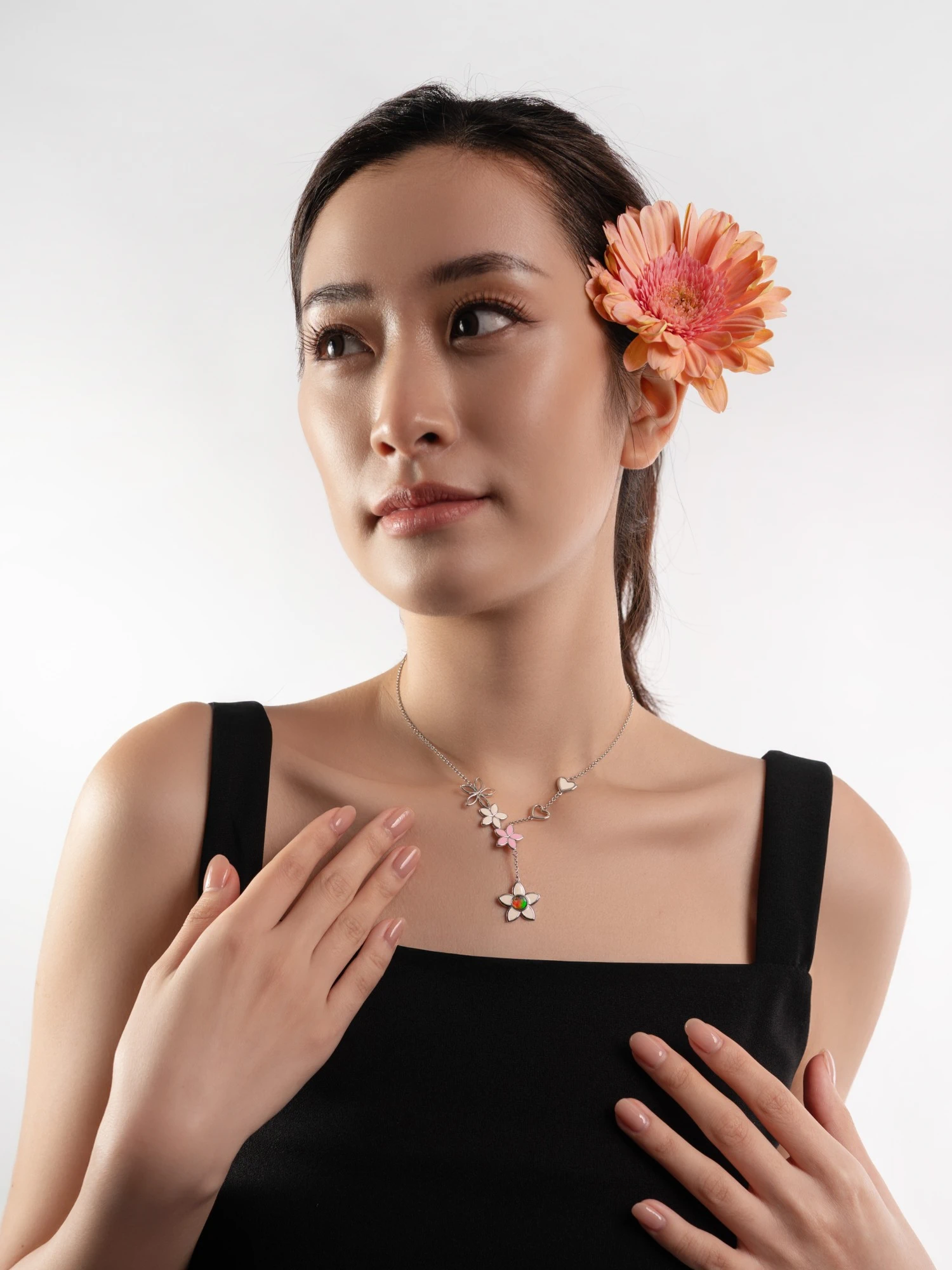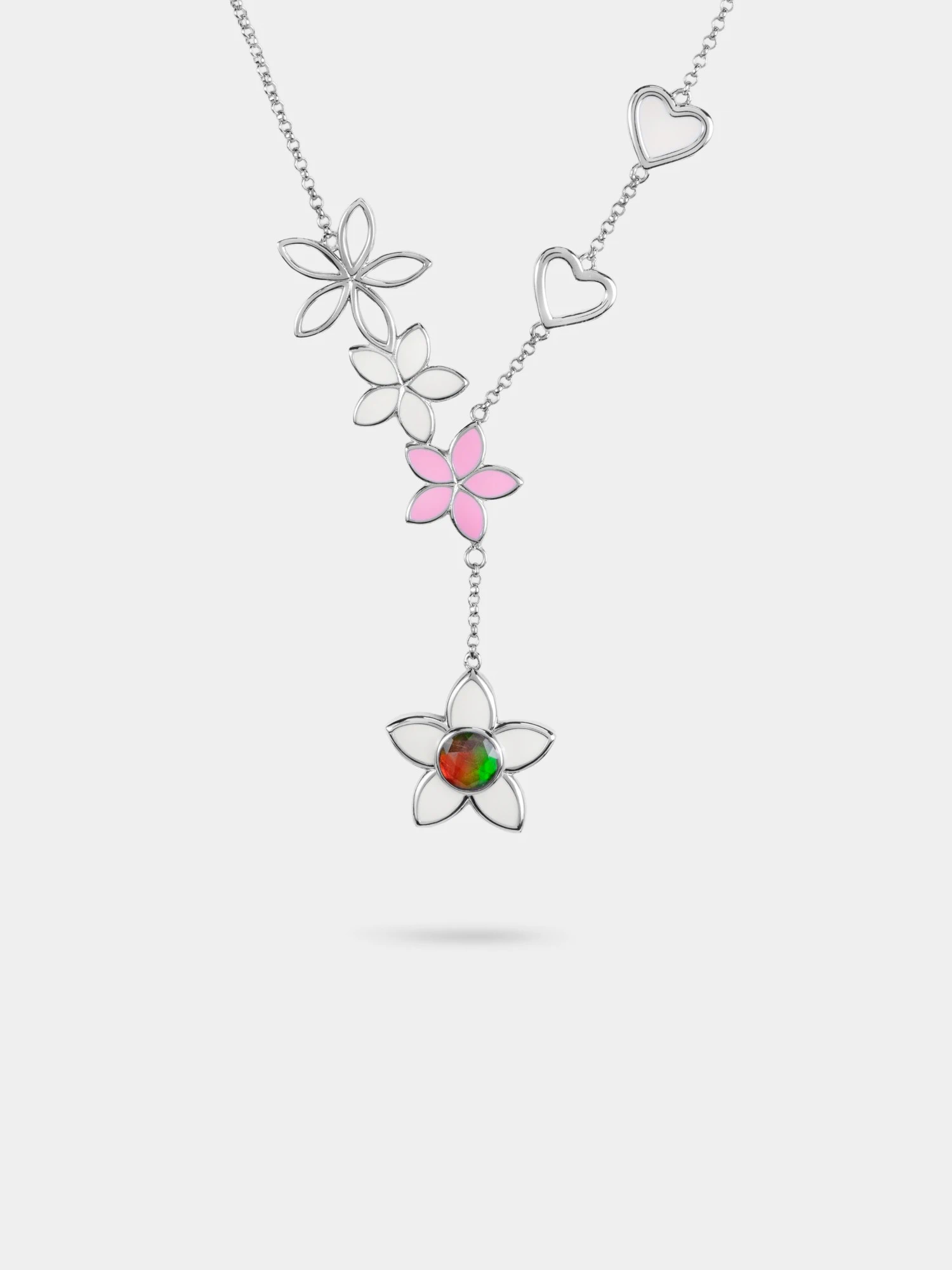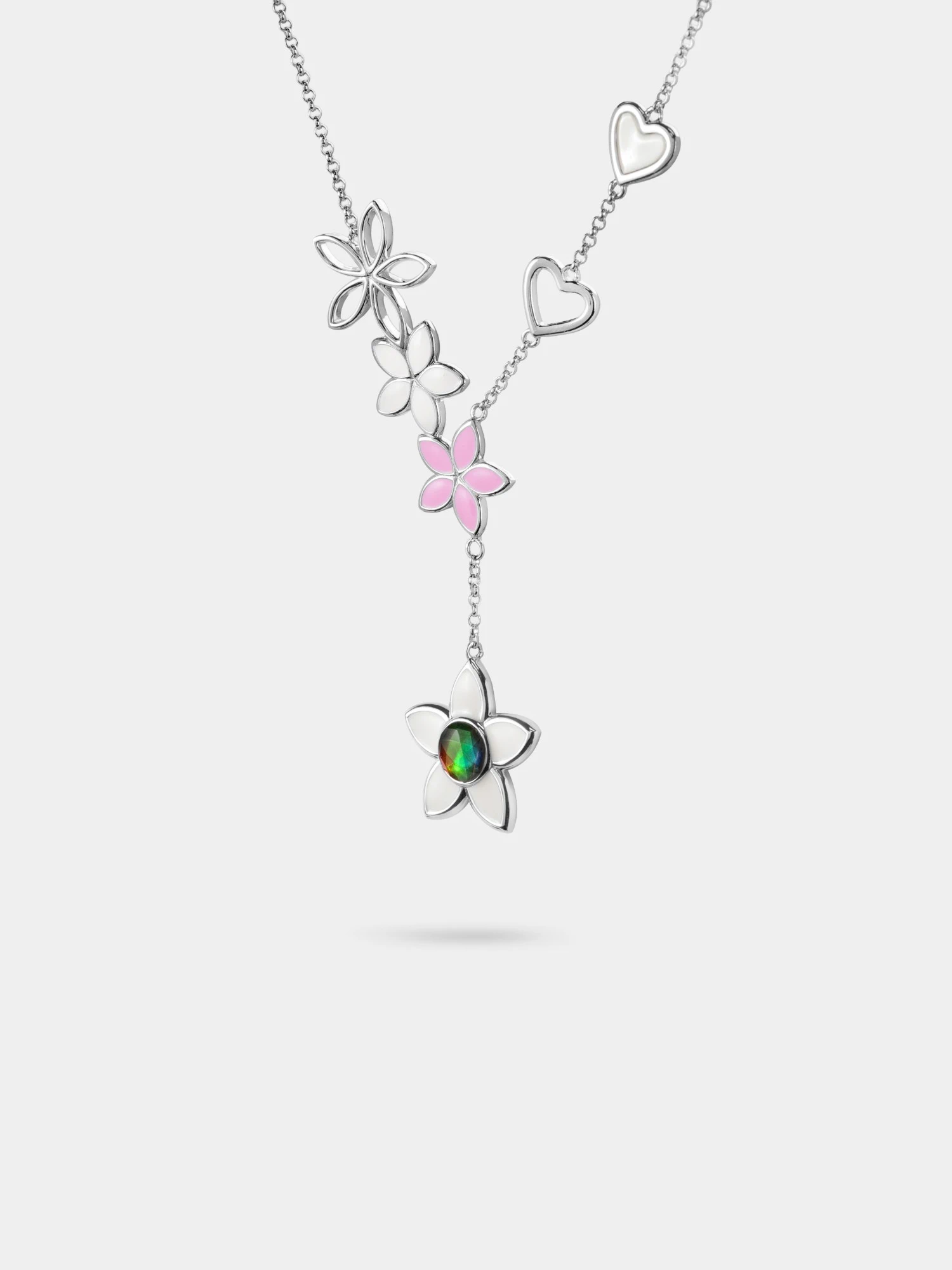 A trail of graphic hearts, clean blossoms, and a sleek ammolite centre keep this lariat necklace polished and light. Wear it solo for soft colour, airy lines, and effortless shine.