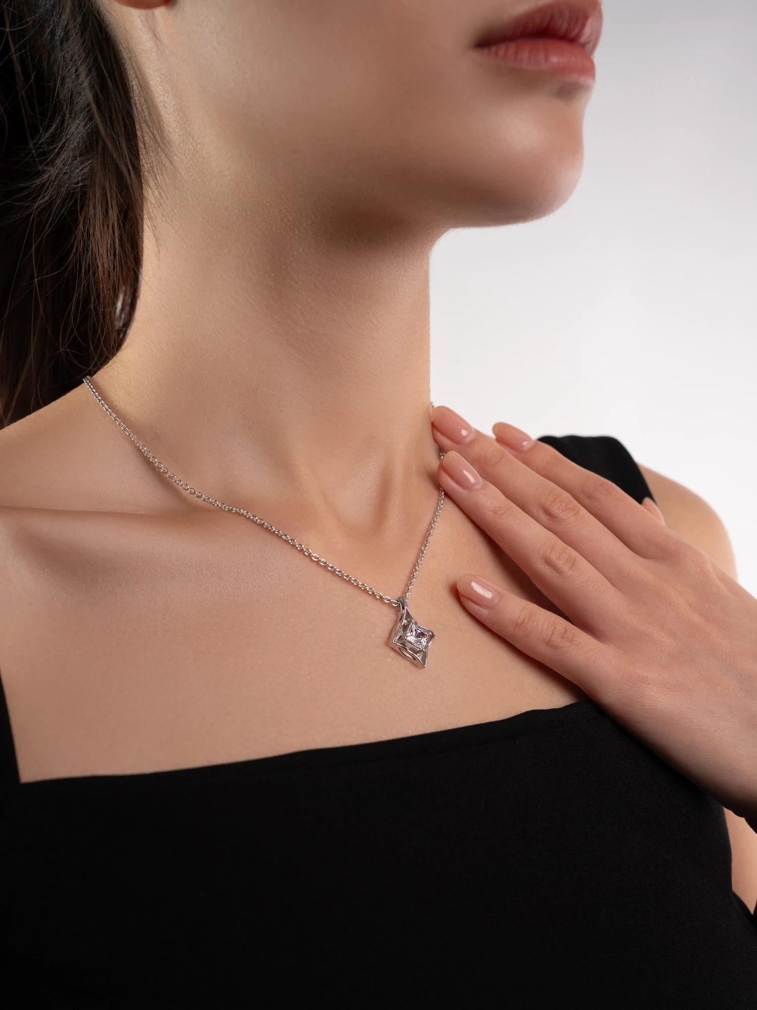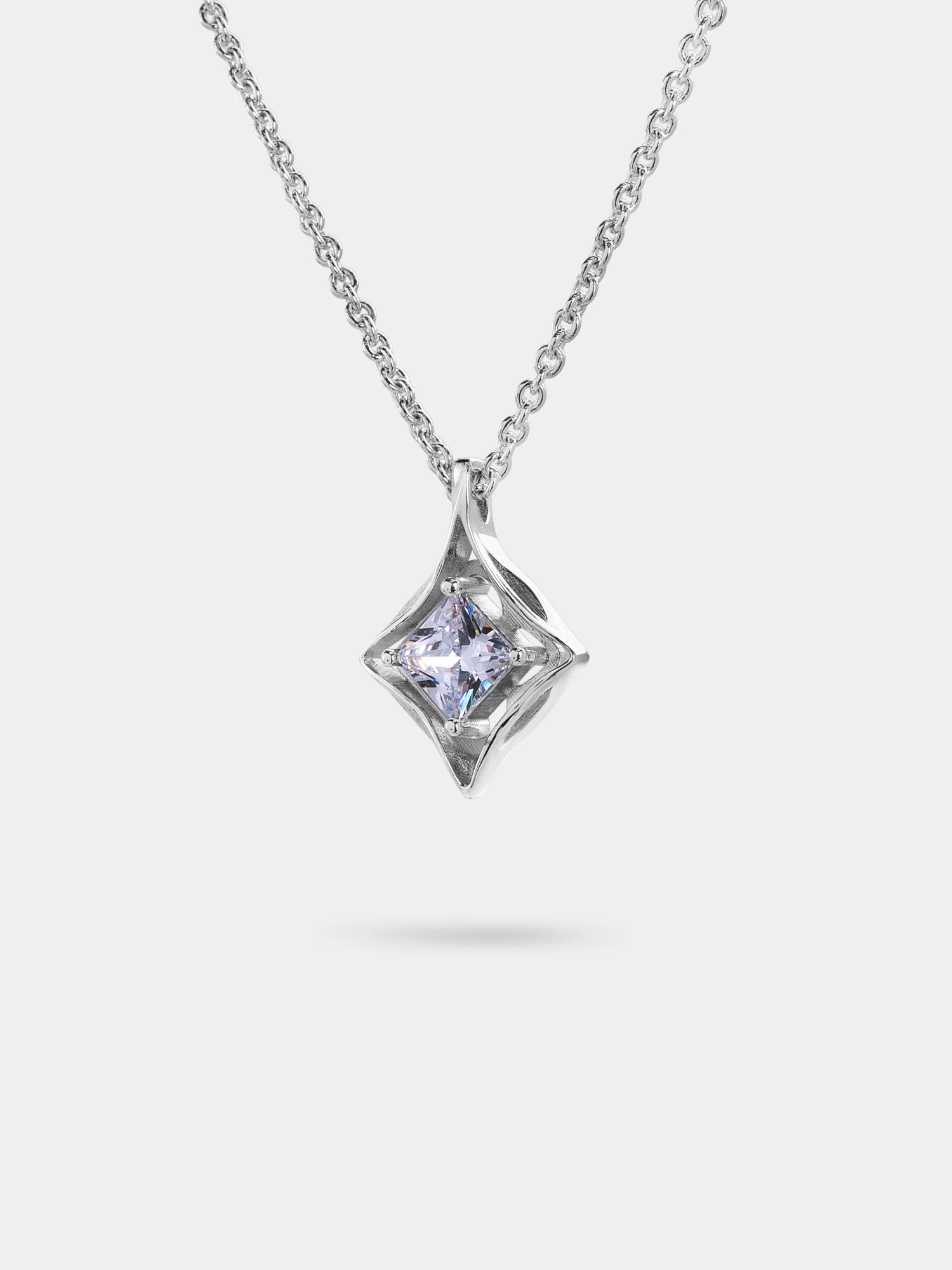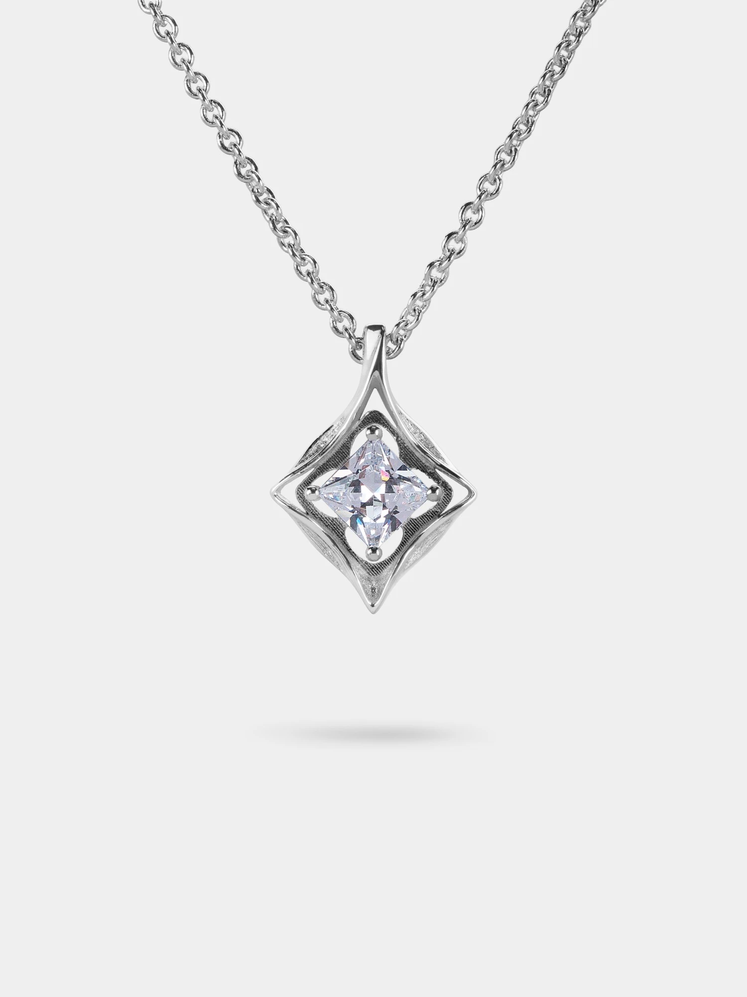 A sculpted petal-star cradles a bright white zircon at the center. A soft shimmer pendant that feels like a kept promise.