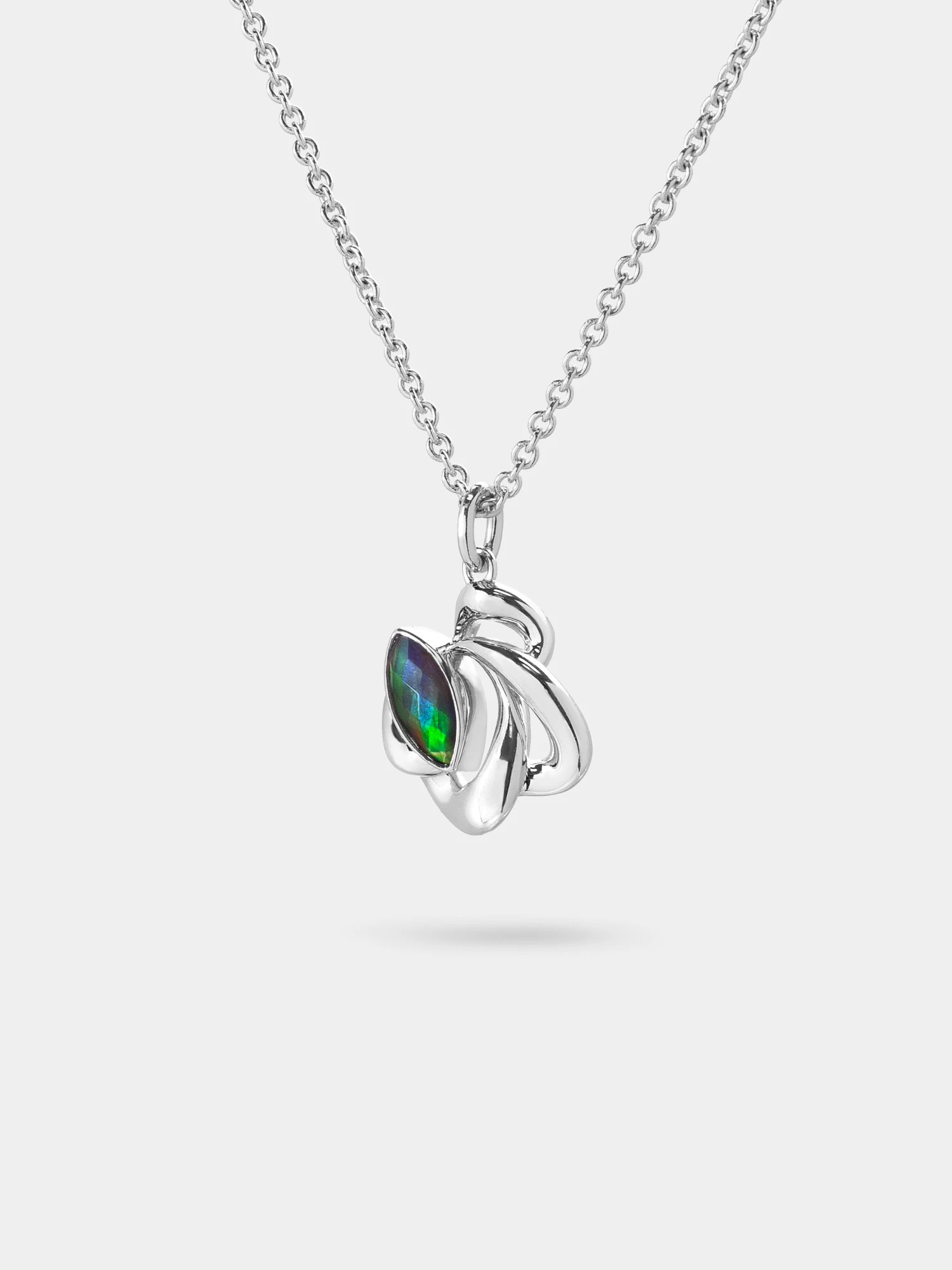 Clean silver ribbons loop around a sleek marquise of ammolite for a compact pendant that layers with everything.