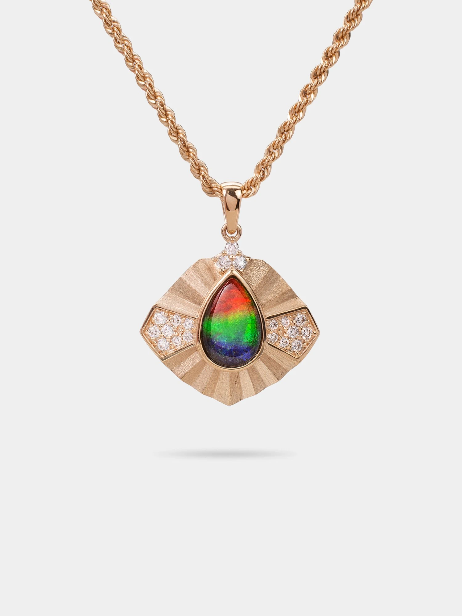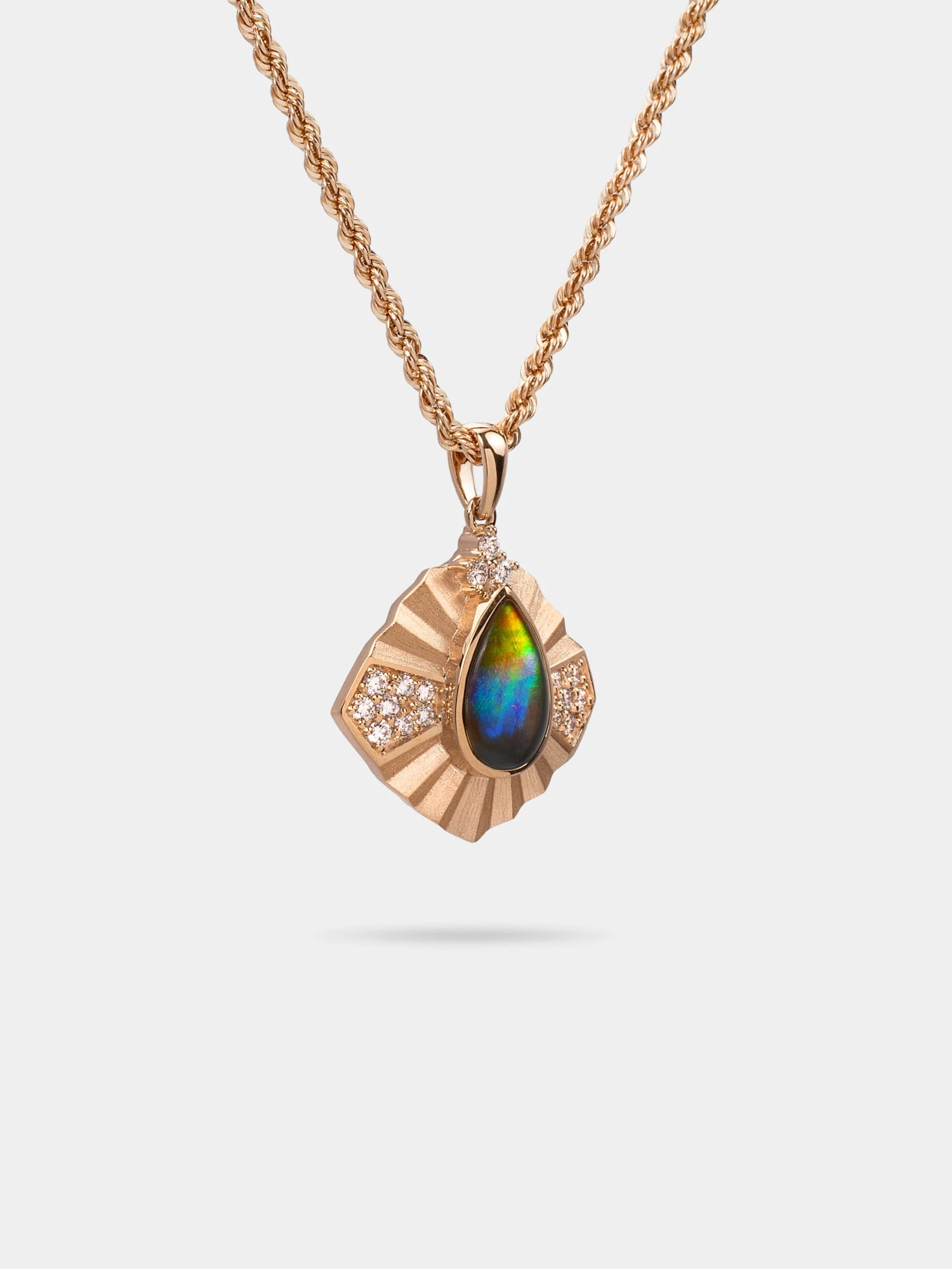 This pendant captures movement, light, and depth in a single design. Framed in gold with diamond highlights, the ammolite reveals a spectrum that feels personal, powerful, and uniquely yours.