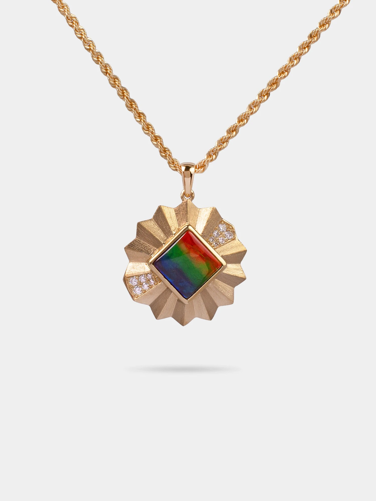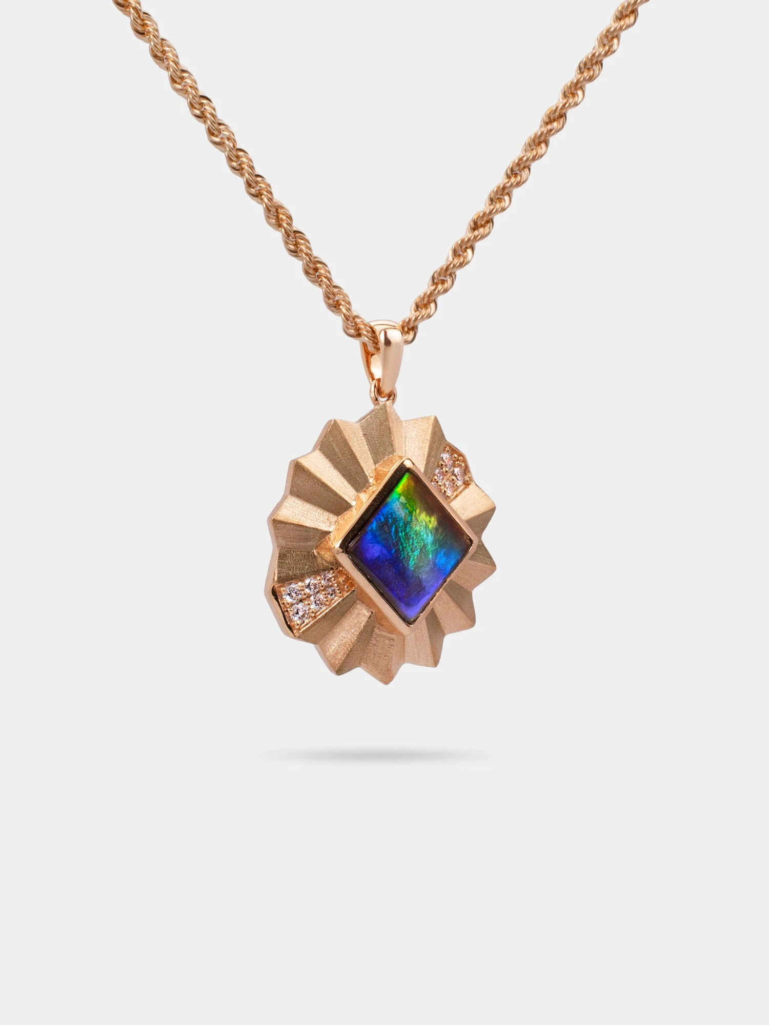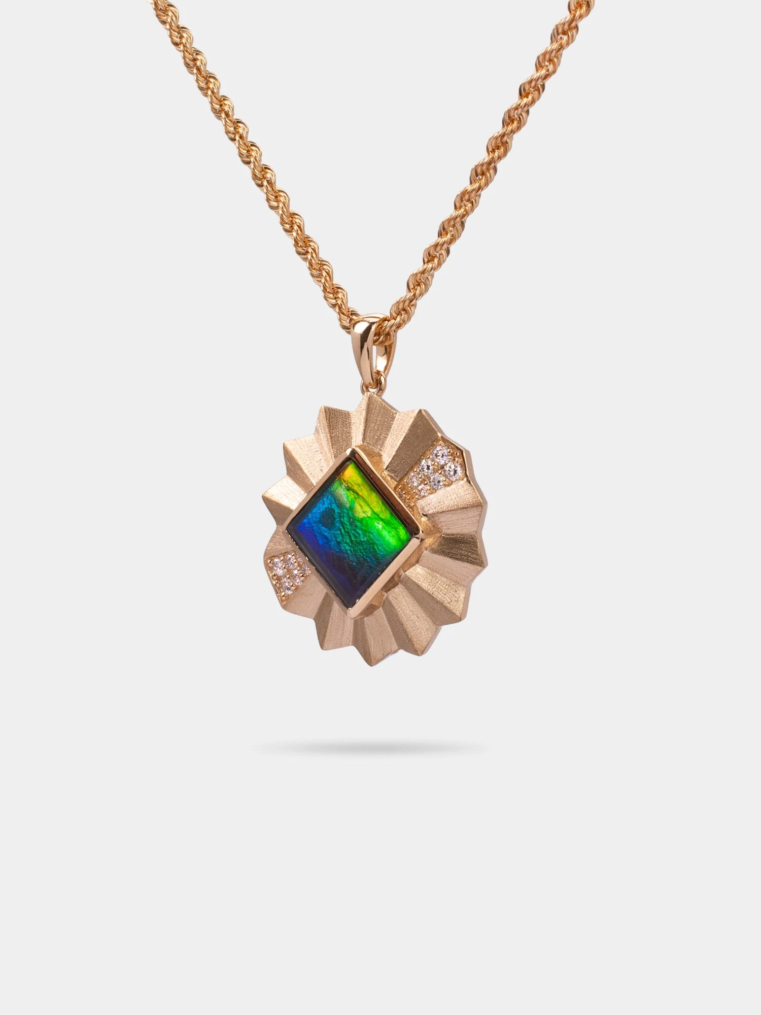 This pendant balances intensity and control with a vivid ammolite held in refined gold geometry, softened by fine diamond accents. Designed for those who favour quiet authority over excess.
