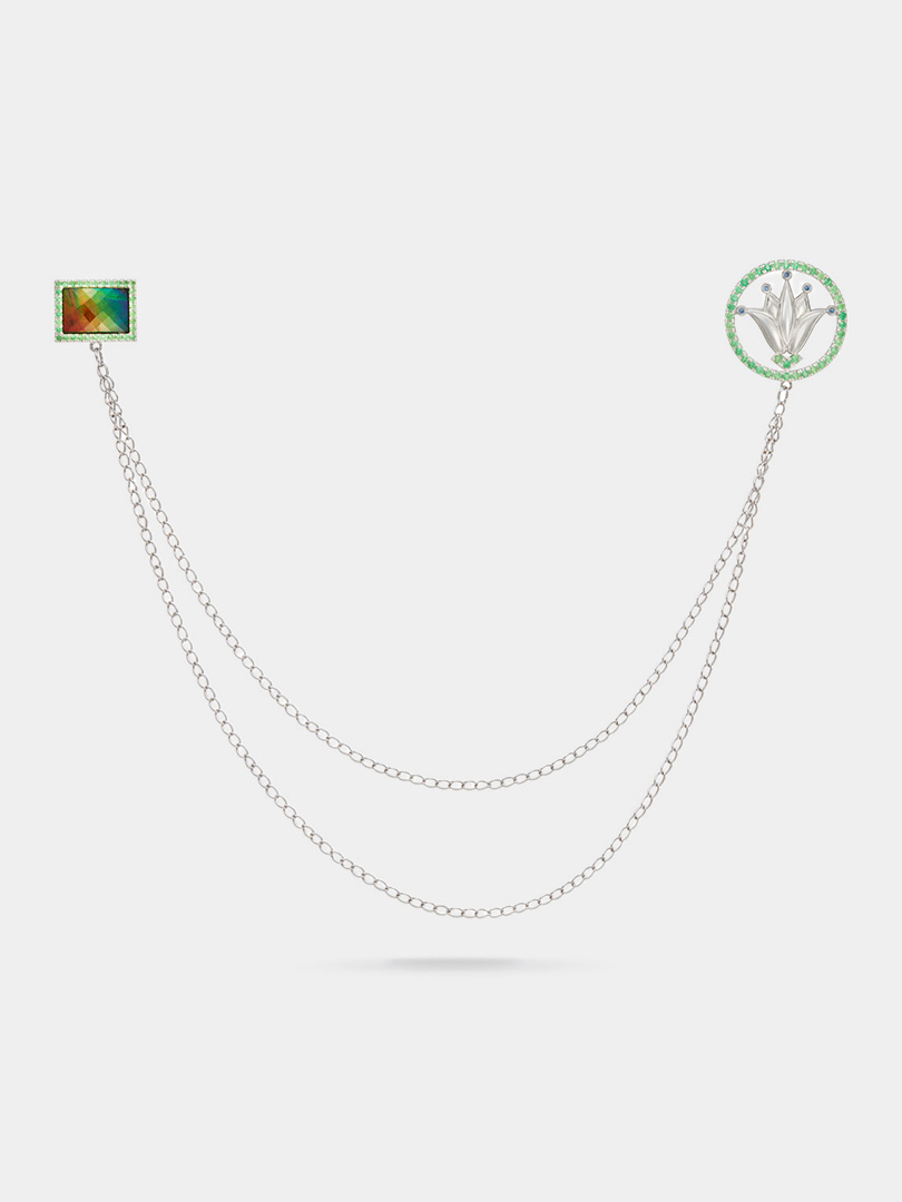 Ideal for elevating the gentlemen’s sartorial style, this set adds a touch of distinguished refinement to a suit or jacket. The ammolite’s multi-coloured brilliance and the delicate flower brooch design create a charming combination.
