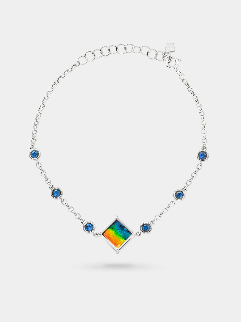A beauty of simplicity that captivates the attention of onlookers. The blue sapphires gracefully arranged to drape around the square-shaped ammolite add a touch of playful colours in elegance. This piece can be worn alone for a dainty look or layered with other pieces for a contemporary look.