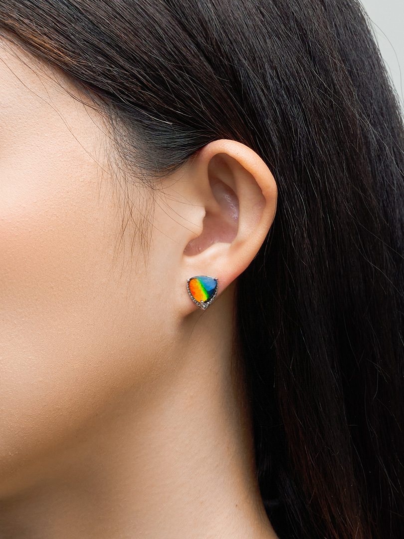 Encased in 18K white gold frame, the Reuleaux triangle ammolite stud exudes modern sophistication and minimalism while paying homage to classical geometric forms. Surrounding the gold frame are tiny, meticulously placed round circles, each adding a touch of delicate intricacy to the design.