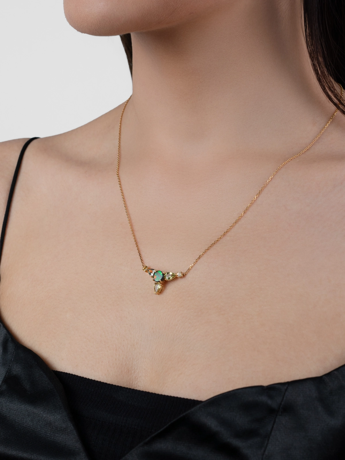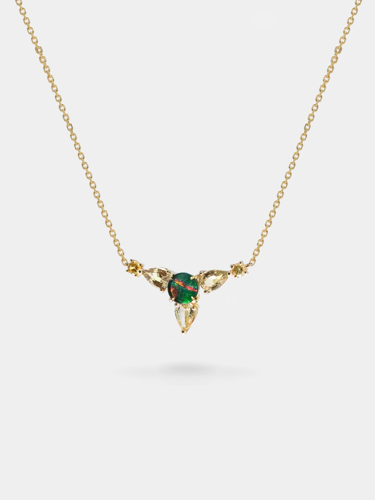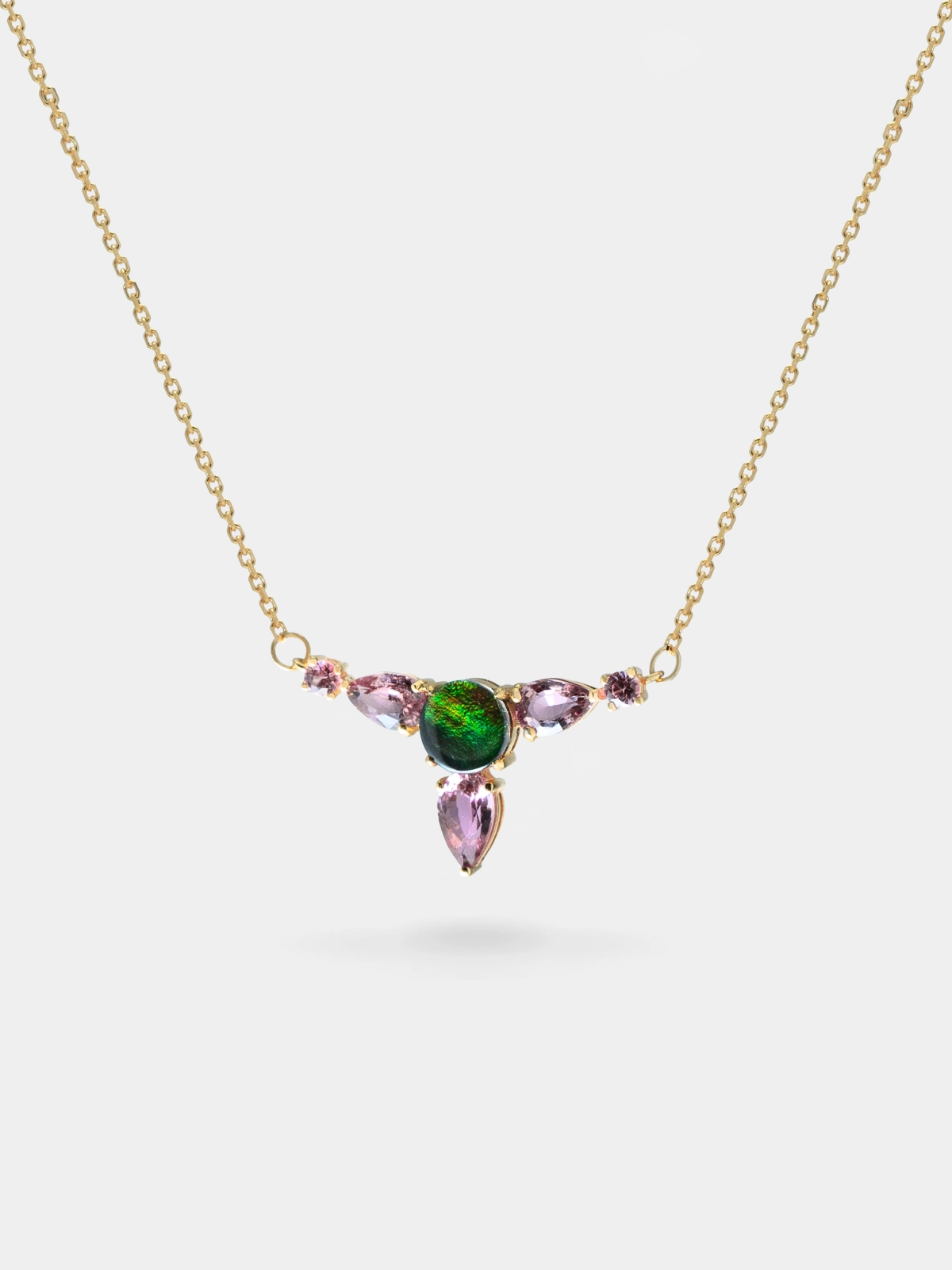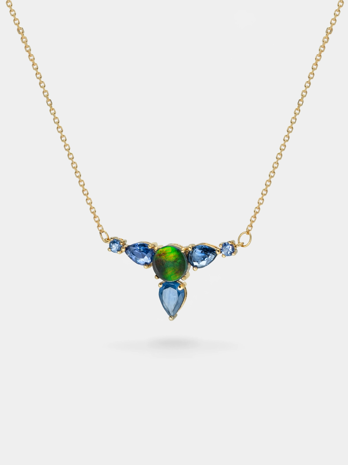 18k gold necklace featuring a stunning round ammolite centerpiece, surrounded by a dazzling array of yellow round sapphires and vibrant green pear-shaped sapphires.