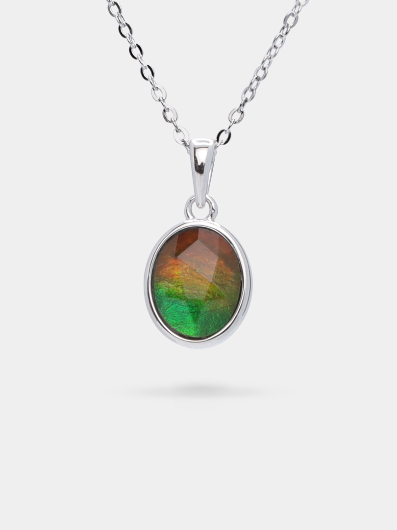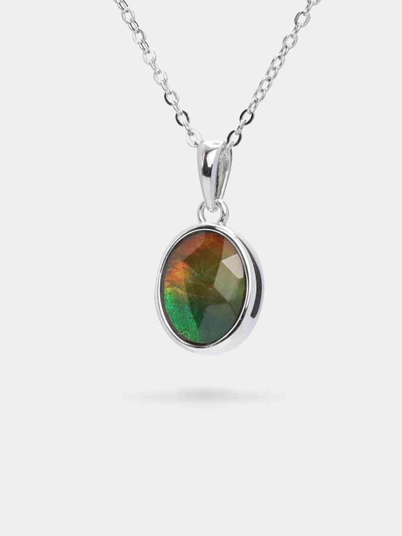This minimalist pendant features a stunning oval-cut ammolite, encased in a sleek, modern setting. The vibrant, iridescent hues of the ammolite, combined with the clean lines of the pendant, create a truly captivating piece. Perfect for someone who embodies timeless simplicity and elegance.