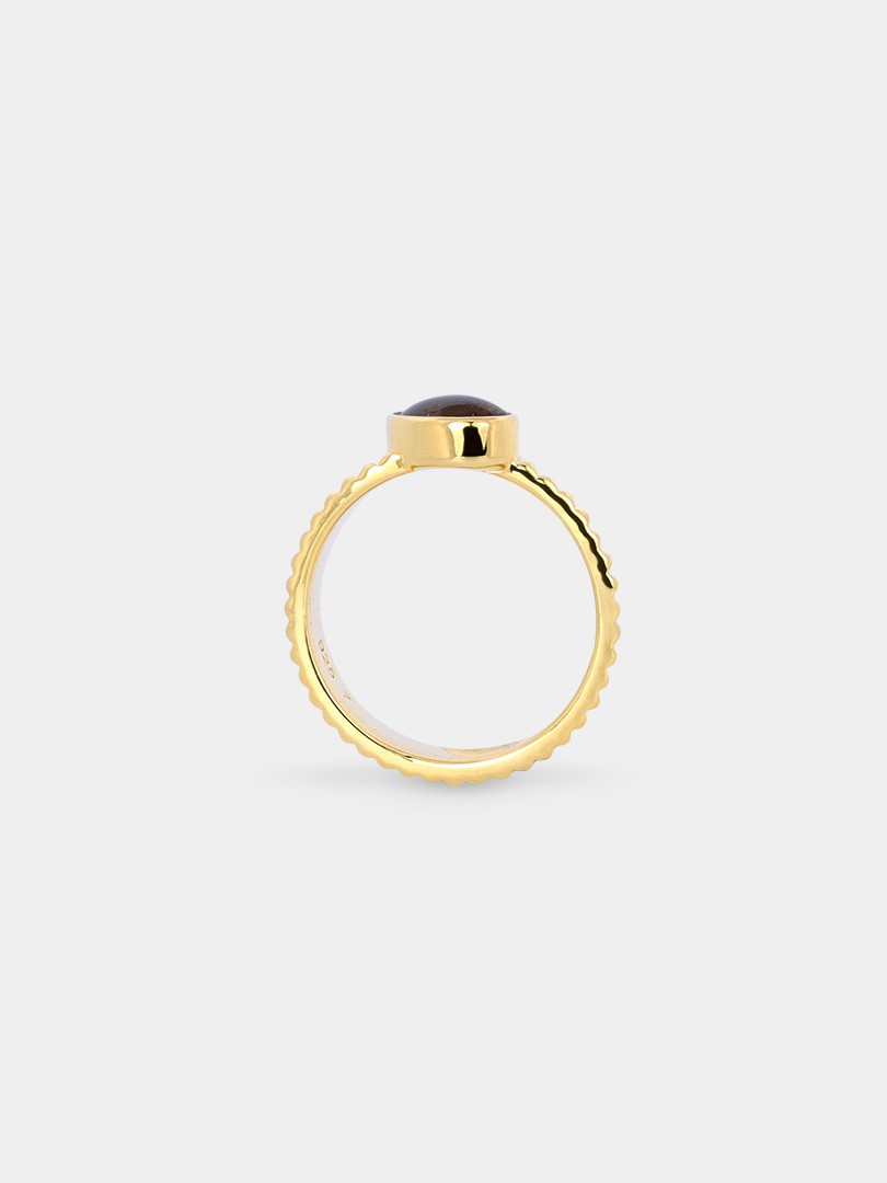 A bold expression of timeless elegance with a captivating round-cut ammolite, set in a modern, minimalist setting. The pleated band adds a touch of texture and sophistication, creating a truly eye-catching piece. This combination of the radiant gemstone and the textured band creates a perfect balance of sophistication and style, making it a standout piece.