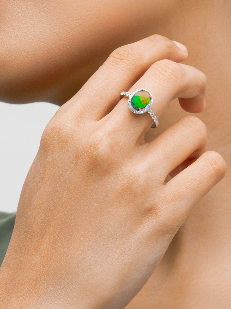 This ring showcases the enchanting beauty of the rare ammolite gemstone within a captivating design. The ammolite’s rich spectrum of hues evokes a sense of wonder and sophistication while the cubic zirconia creates a continuous line of brilliance that complements the central gemstone and its halo.