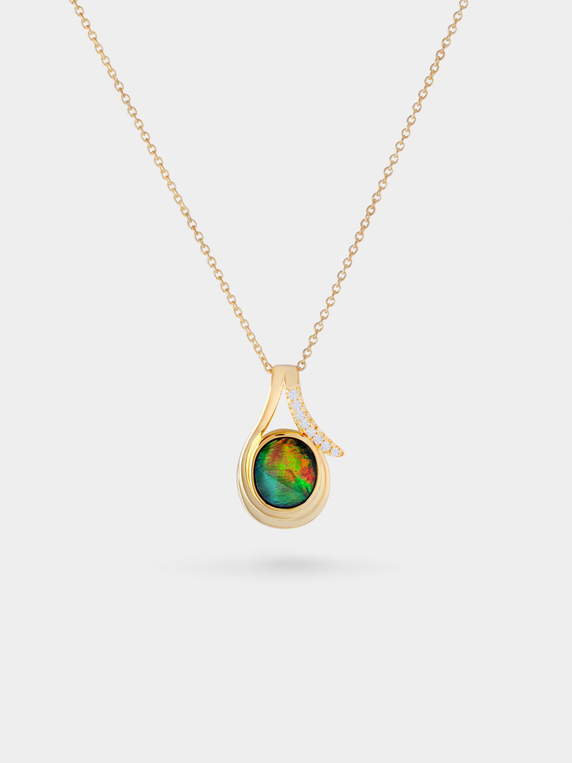 This pendant captures the beauty of simplicity with its elegant, minimalist design. Featuring an oval ammolite at its centre, the stone is gracefully framed by a sleek, flowing hook-inspired design. It embodies understated sophistication, perfect for those who appreciate timeless style with a subtle touch of charm.