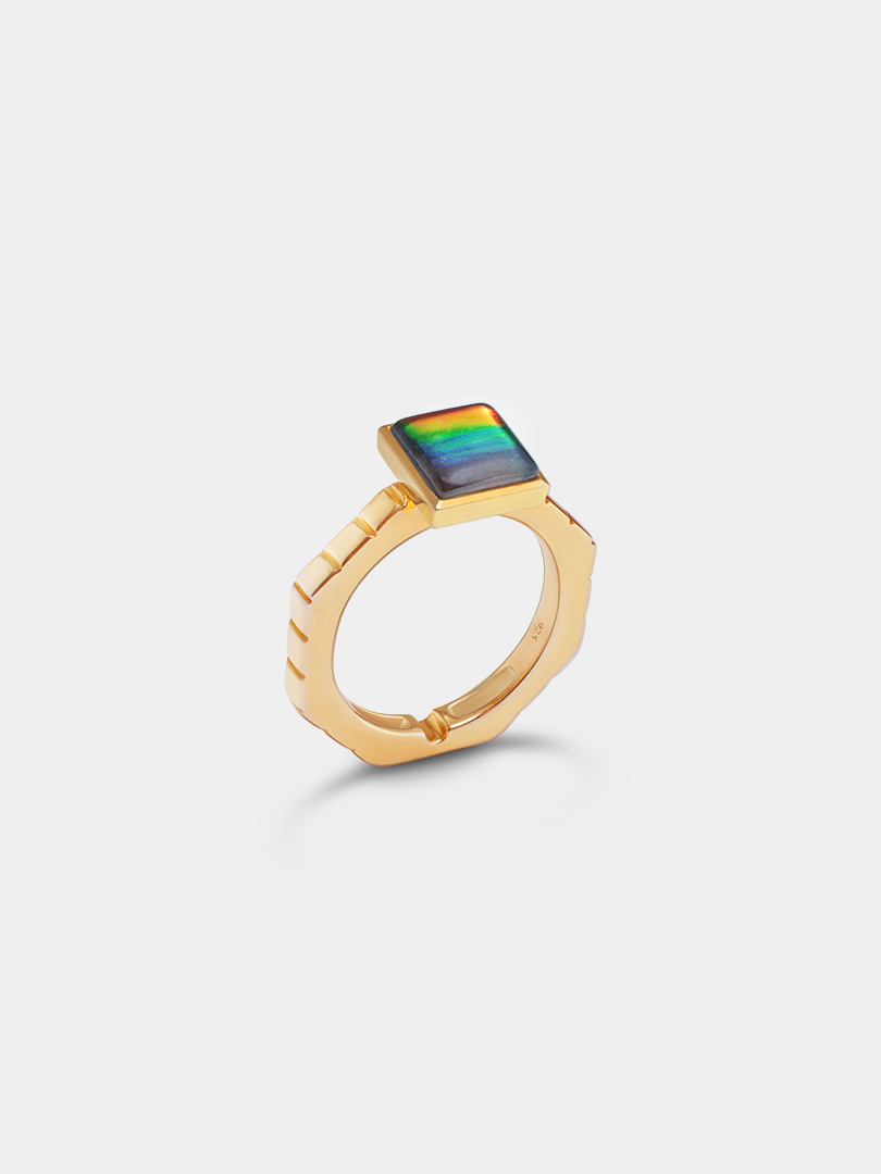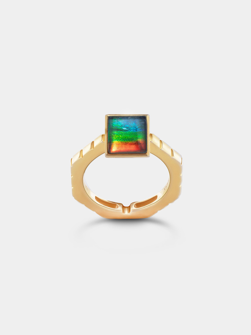 Channel your duality with a versatile square ammolite ring that transforms into a stunning necklace.