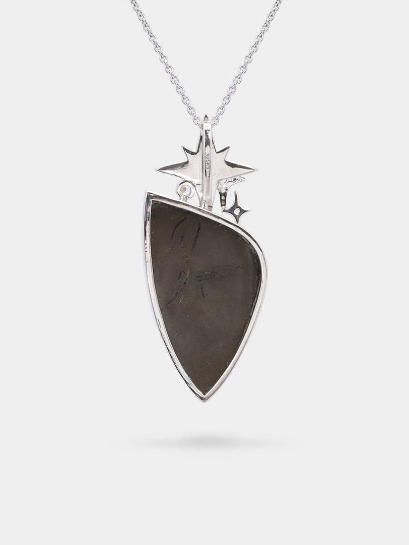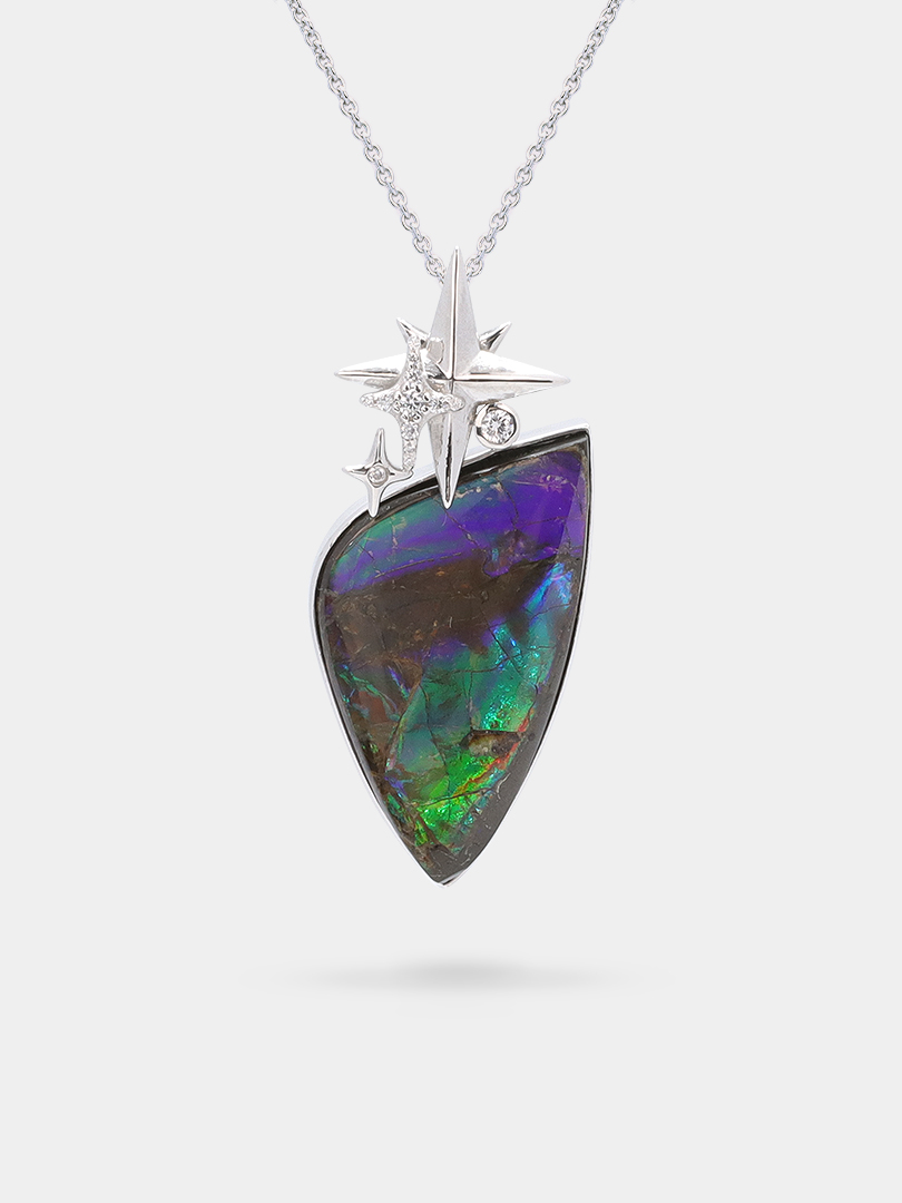 Featuring a captivating freeform ammolite pendant that dazzles with its unique patterns and vibrant hues, this pendant shimmers like stardust against the night sky. The bail is designed as a constellation of tiny glittering stars, each star elegantly paved with zirconia, evoking the magic of a starlit night. This enchanting design perfectly captures the ethereal allure of the cosmos, making it an extraordinary piece for those who dream of the stars.