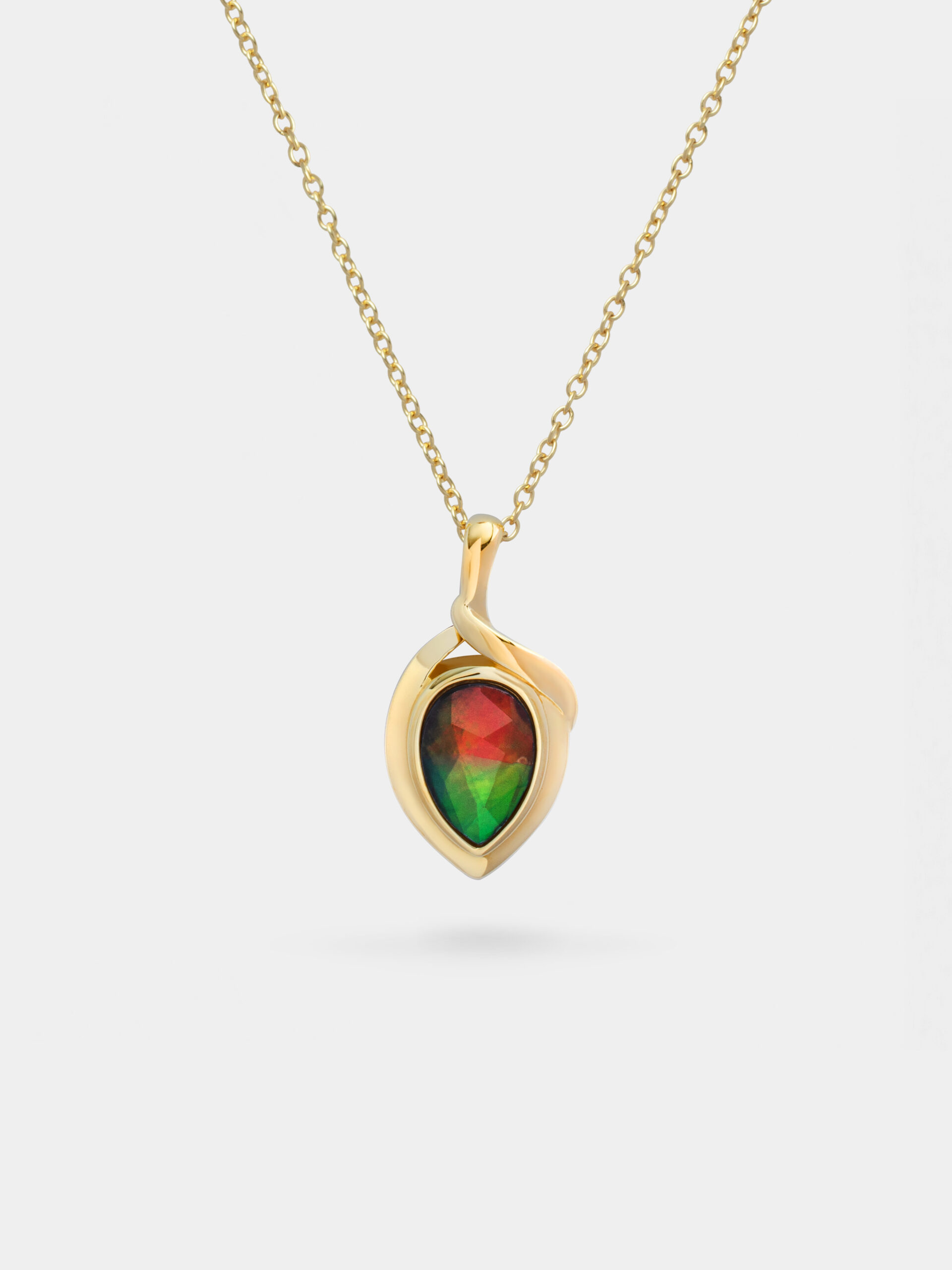 This enchanting design showcases an upside-down teardrop ammolite, exuding its natural glow. A twist knot-shaped bail adds a touch of sophistication, symbolizing unity and charm, while the ammolite’s natural brilliance steals the spotlight.