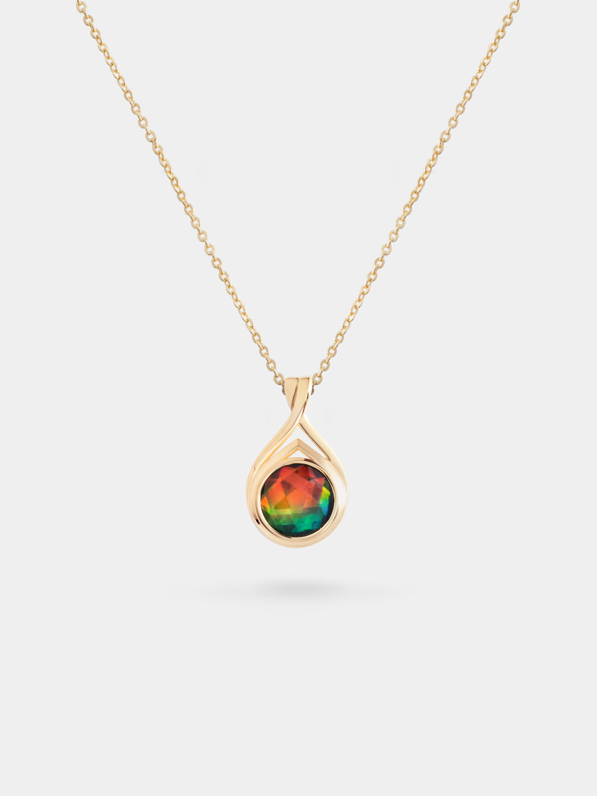 This stunning piece features a hollow, double-layered dewdrop design, with both layers seamlessly coming together to create a sense of unity. At its heart lies a radiant round ammolite, symbolizing the balance and the beauty of nature’s delicate curves.