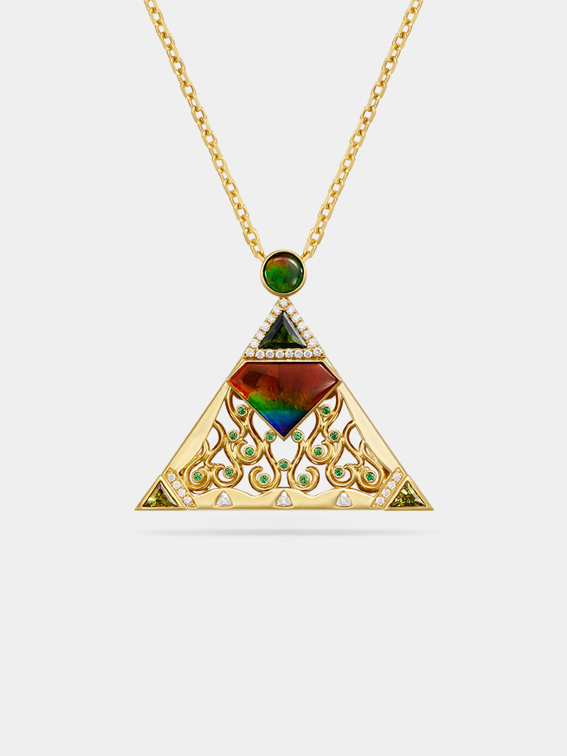 Embrace the blazing energy of fire with this necklace, inspired by the sun’s brilliance and the untamed flames. It features a fiery ammolite gemstone, its iridescent colours glowing with a mesmerizing play of orange, red, and blue. The ammolite is meticulously set in a bold 18K gold triangle-shaped pendant, echoing the geometric form of flames. This necklace is a fiery statement piece that embodies the untamed spirit.