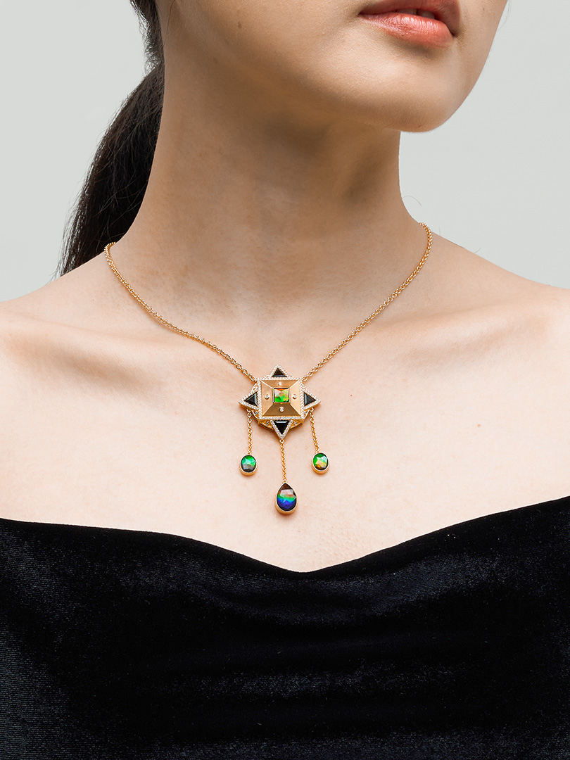 Embrace the harmonious union of geometric precision and radiant gemstones with this captivating necklace. At the heart of the necklace lies an exquisite ammolite surrounded by a dynamic and striking composition of geometry designs. The deep hues of green tourmaline contrast beautifully with the iridescent shimmer of an embossed gold and cushion-cut ammolite nestled on top. Delicate dangles of ammolite gemstones complete the celestial symphony, adding fluidity and sparkles.