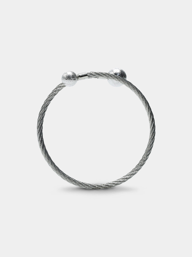 This extraordinary piece features an open, adjustable wire design that gracefully curves around your wrist. Gracing each end of the bangle are mesmerizing spheres of pure Muonionalusta meteorite.
