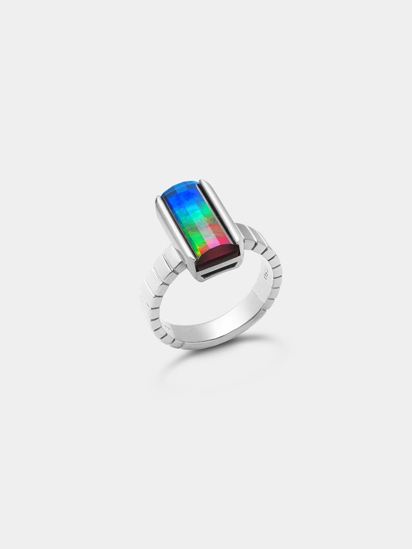 A stunning fusion of contemporary design and aesthetically pleasing geometry. At the heart of this ring lies a striking rectangle faceted ammolite set within a band of fine 18K gold, which features a distinctive pleating pattern.