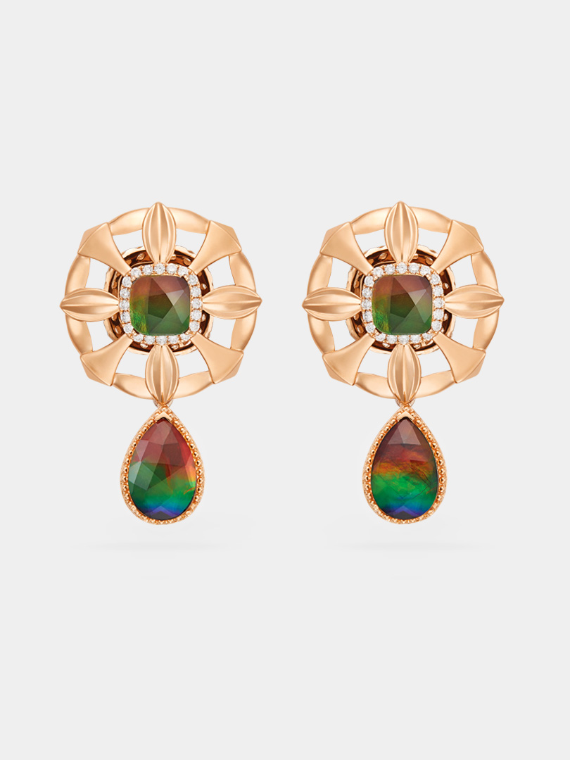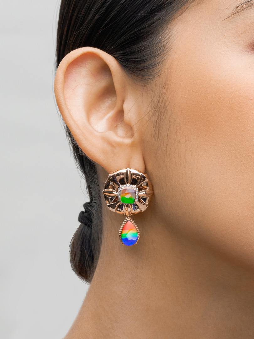 Mesmerizing and eye-catching, these earrings feature an intricate gold structure of a beautiful flower motif with petal-like elements. The centrepiece of each earring is a cushion-cut ammolite gemstone surrounded by a halo of tiny, sparkling diamonds.